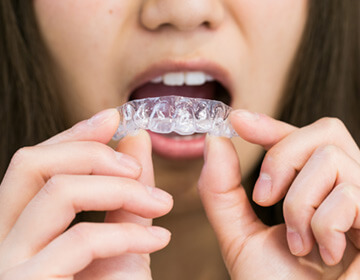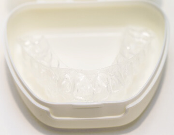 歯にマウスピースを装着します。装着の仕方は医院で説明されたやり方で正しく装着してください。